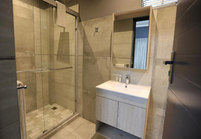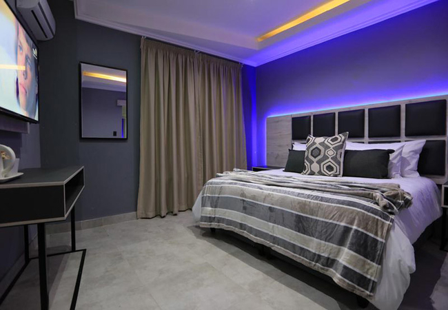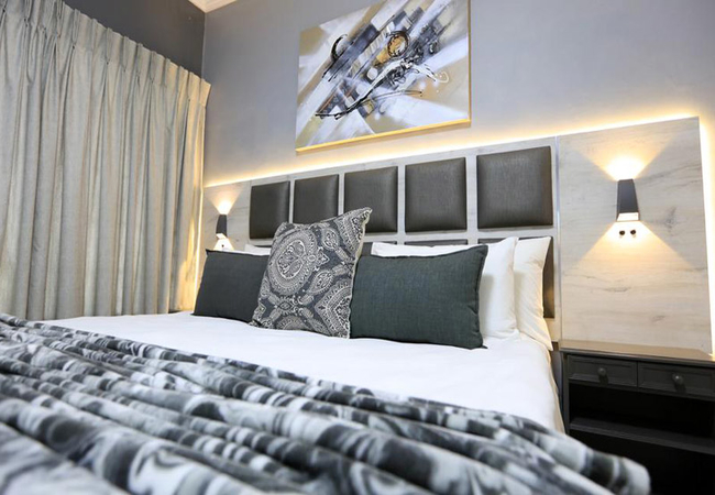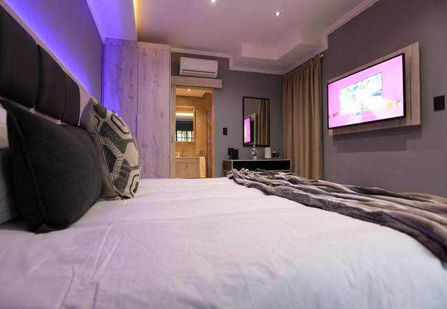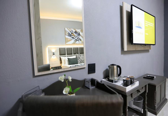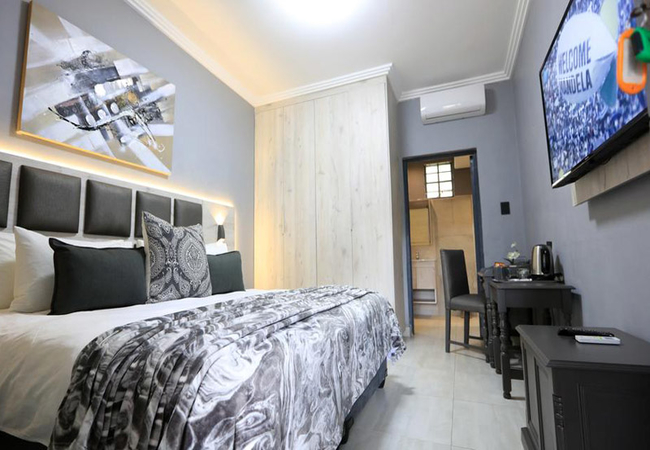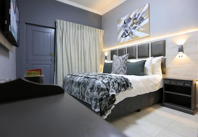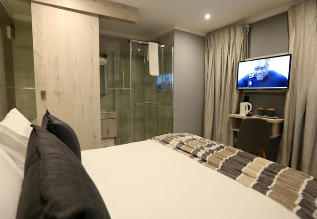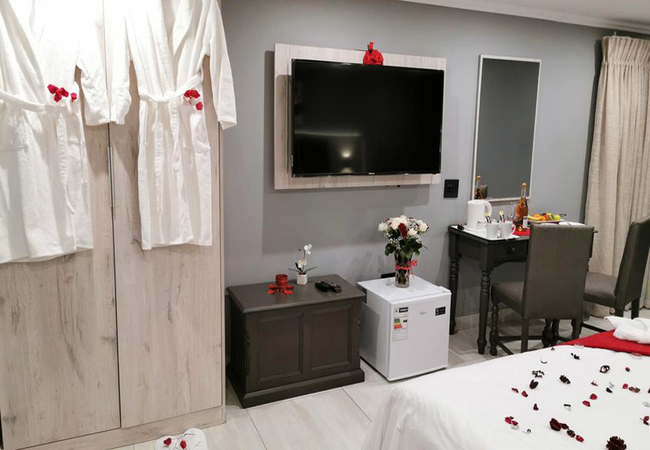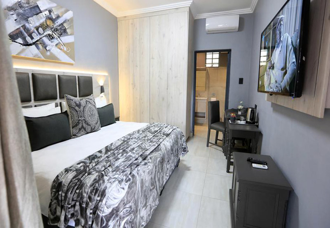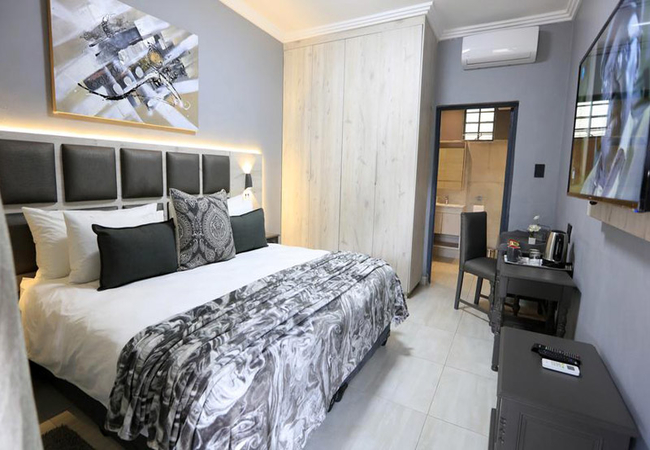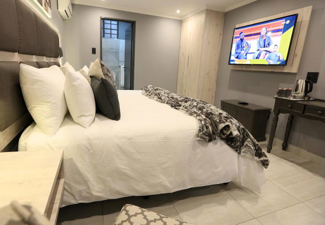 The Deluxe Queen Room is furnished with a luxury Queen-size bed. The en-suite and private bathroom is equipped with a shower, hand basin and toilet. A flat-screen TV with DStv, air conditioning, free Wi-Fi, free private parking and a coffee station.