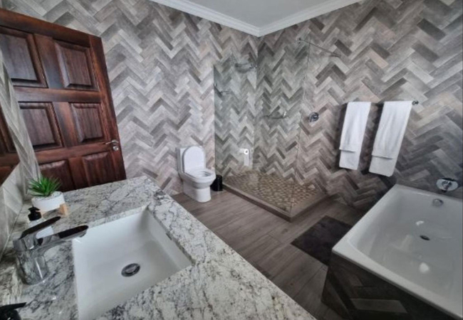 Two Bedroom Apartment has two bedrooms. The main bedroom is furnished with a Queen-size bed and has an en-suite bathroom fitted with a bath, shower, toilet and basin. The second bedroom is furnished with double or twin beds and has an en-suite bathroom fitted with a shower, toilet and basin. The apartments each have a modern kitchen with a gas stove, microwave, fridge and tea / coffee making facilities. There is a comfortable lounge area, TV with DStv, Wi-Fi, portable battery lights and backup power for electronic devices.