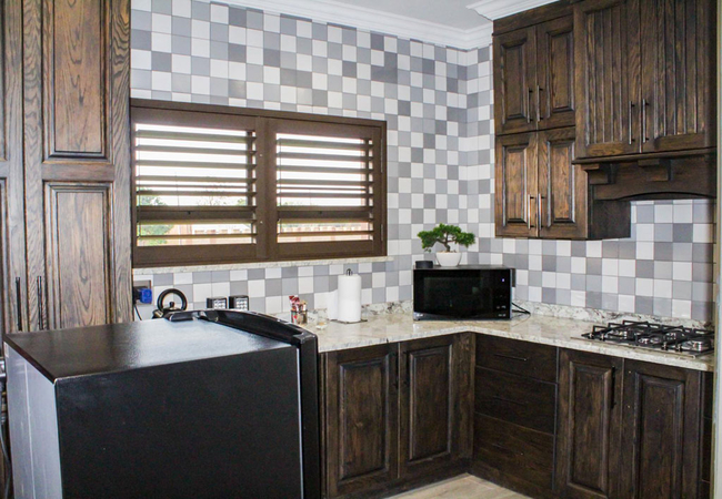 One Bedroom Apartment has one bedroom furnished with a Queen-size bed. The en-suite bathroom is fitted with a bath shower, toilet and basin. The apartments each have a modern kitchen with a gas stove, microwave, fridge and tea / coffee making facilities. There is a comfortable lounge area, TV with DStv, Wi-Fi, portable battery lights and backup power for electronic devices.