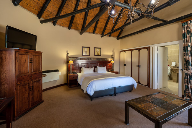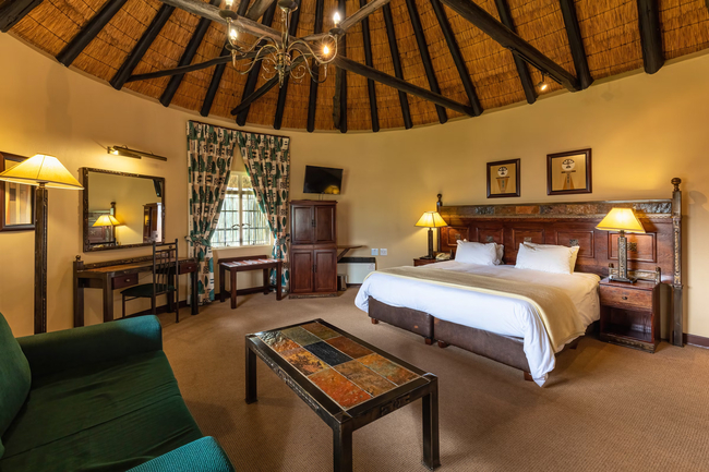 These charming open-plan, thatched rooms are nestled within the beautiful gardens, offering accommodation for up to three guests. Each room is furnished with a king-size bed and a sleeper couch, providing both comfort and flexibility. The en-suite bathroom is well-equipped with a bath and an overhead shower for a relaxing experience. Guests will also find a variety of in-room amenities, including a television with selected channels, a fan, a heater, a telephone, and a mini-bar, which can be stocked upon request. Tea- and coffee-making facilities are provided for added convenience, and outside, guests can enjoy their own private verandah, perfect for soaking in the serene surroundings. These non-smoking rooms also feature a private entrance and a patio, ensuring privacy and a peaceful outdoor area for guests. Room service is available, and rooms are serviced daily to maintain a fresh and welcoming environment. Guests also have access to wireless internet, telephone services, and the option to schedule a wake-up call. The en-suite bathroom includes both a bath and a shower, along with soaps and essential toiletries for a comfortable stay. Each room is equipped with a fan for comfort and a safe for securing valuables. For added convenience, a hair dryer is provided, and guests can enjoy refreshments with the bar fridge and tea and coffee tray available in the room. Entertainment is taken care of with exclusive DStv channels and a TV for guests to enjoy during their stay. The rates are inclusive of dinner, lunch, bed and breakfast, along with mid-morning and afternoon tea, ensuring a satisfying and memorable experience.