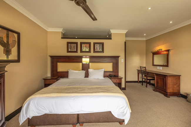 Each of these spacious and inviting rooms is designed to comfortably accommodate two guests, offering the option of a king-size bed or two single beds. The en-suite bathroom is well-appointed with both a bath and a shower, complemented by soaps and essential toiletries. Guests can enjoy various in-room features, including a television with exclusive DStv channels, a fan, a heater, a telephone, and tea- and coffee-making facilities. A bar fridge and a tea and coffee tray provide convenient refreshment options, while a hair dryer is available for added convenience. Each room also has access to a private verandah, offering a peaceful outdoor space to relax. Room service is available, and the rooms are serviced daily to ensure a fresh and comfortable stay. Guests have access to wireless internet and can request wake-up calls if needed. The rooms are non-smoking and feature a private patio for additional outdoor enjoyment. A fan is provided for cooling, and a safe is included for securing personal belongings. The rates are inclusive of dinner, lunch, bed and breakfast, as well as mid-morning and afternoon tea, ensuring a thoroughly enjoyable and satisfying stay.