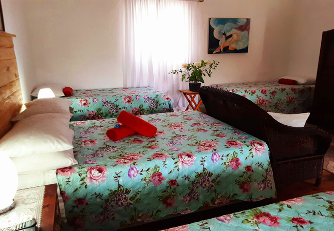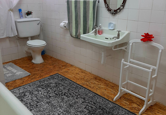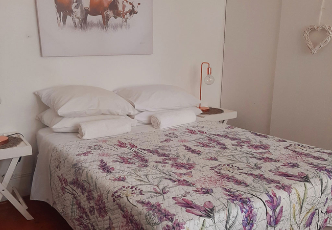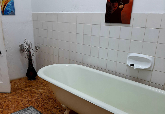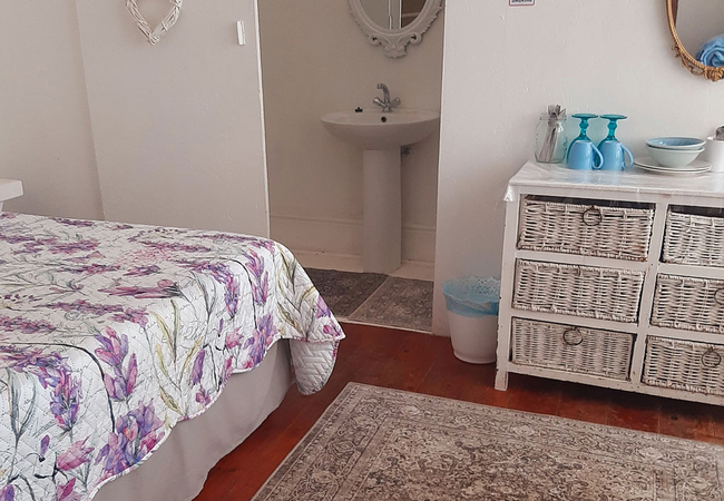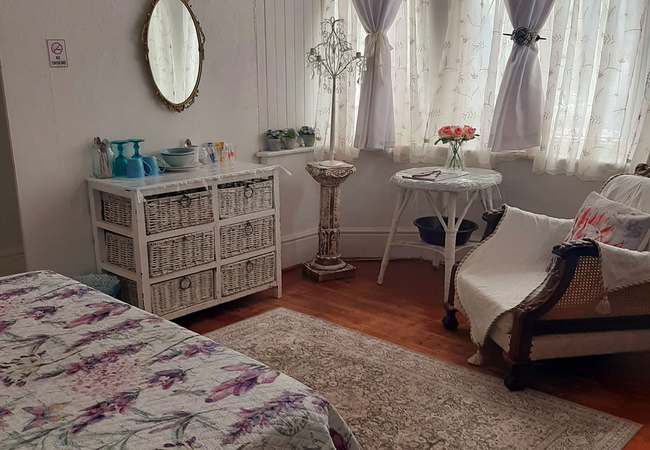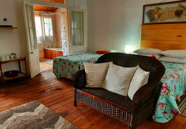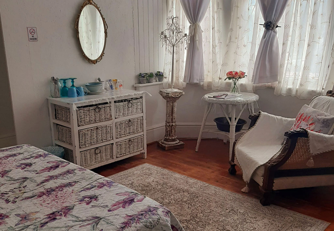 White Room is furnished with two single beds and makes use of a separate shared bathroom down the hall that is fitted with a shower, bath, toilet and basin. The room is equipped with a tv, microwave, fridge, cutlery, crockery and coffees, teas, milk and sugar. Towels are included and a working space.