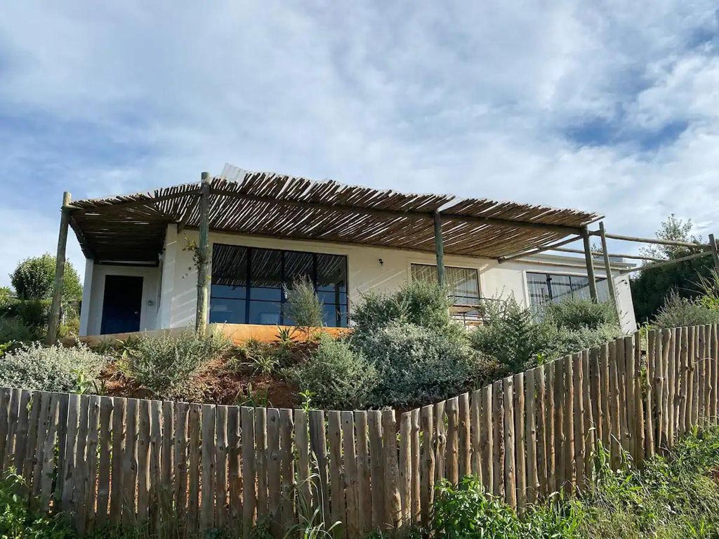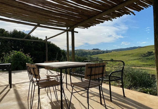The cosy living area opens onto a patio with outdoor seating and braai facilities and views of the surrounding area.