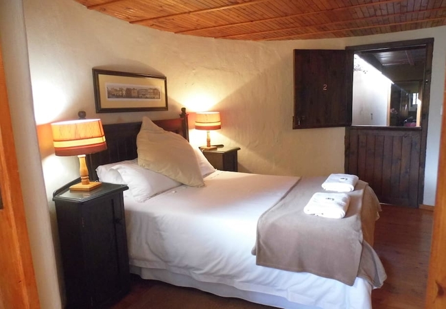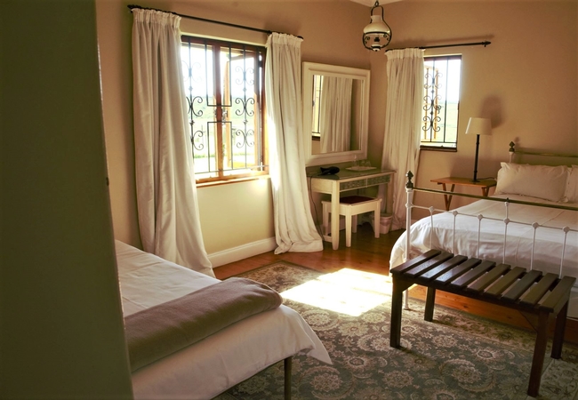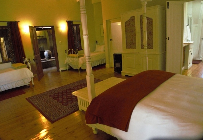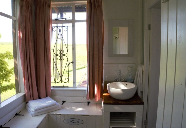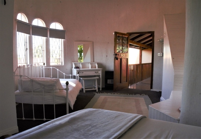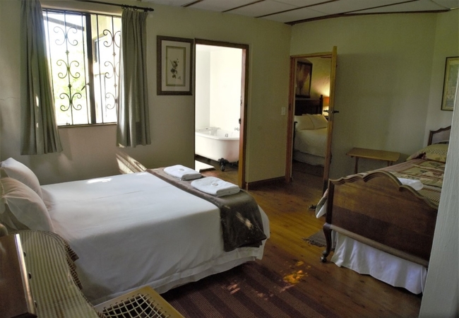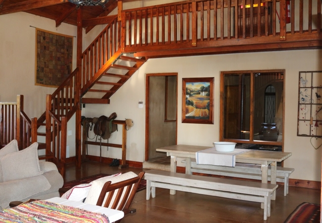 The living room is pure olde-world rustic charm with an enormous fireplace. DsTV is available in the shared living space, which is open-plan to a fully equipped kitchen / dining room. Weber and braai facilities are available. Guests have use of the farm tennis court and pool and can enjoy beautiful country walks.