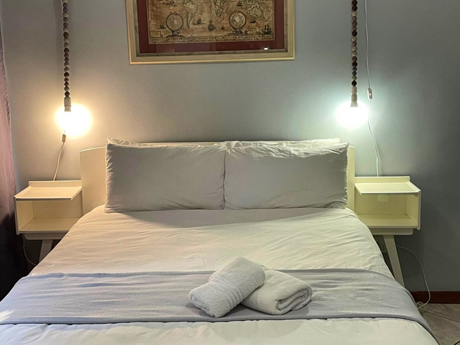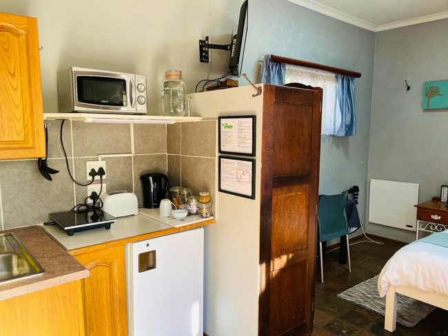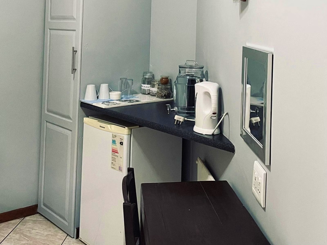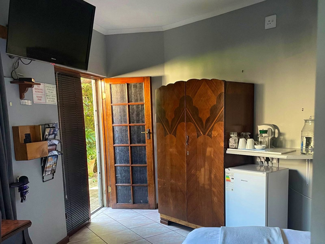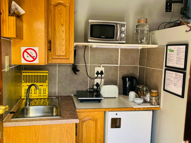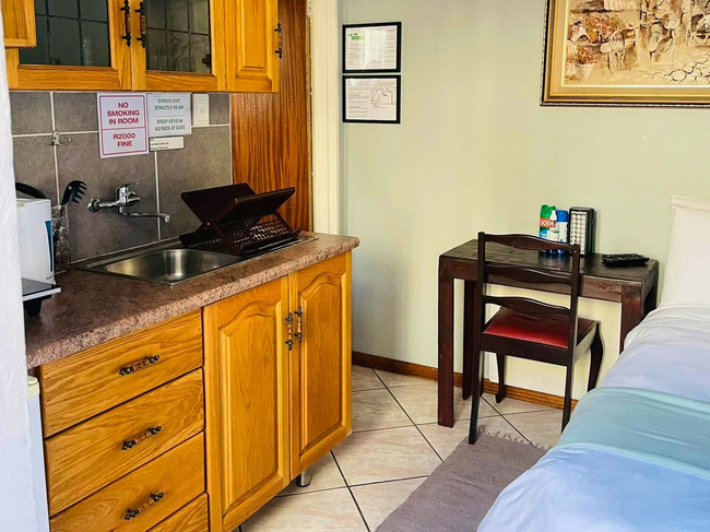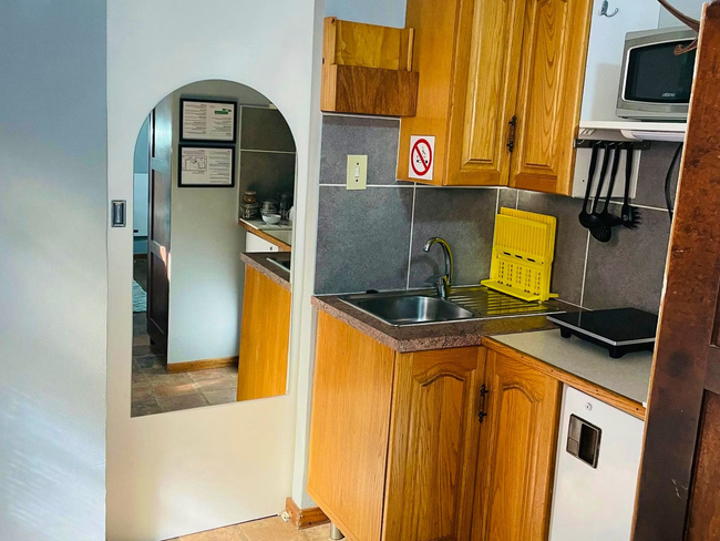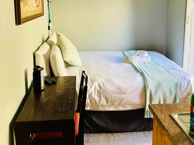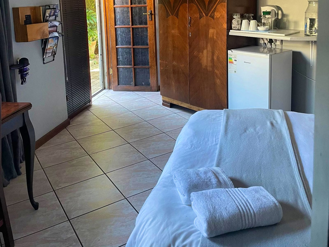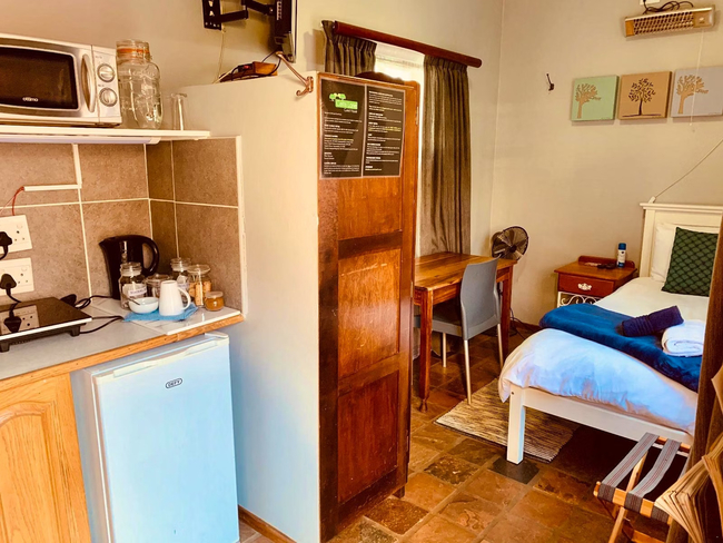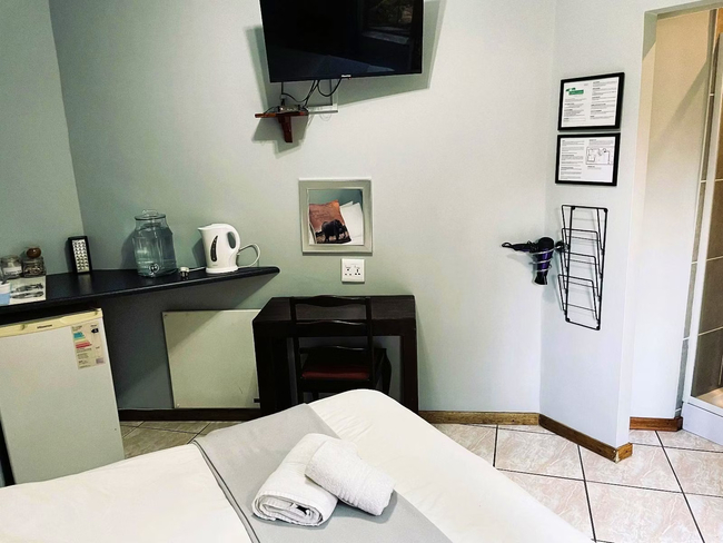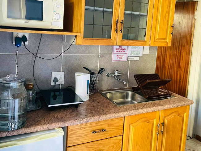 Perfect for a relaxing stay, the Oregon Double Room accommodates up to two guests. The room features a double bed and an en-suite bathroom, complete with a shower, washbasin, and toilet. Linen and towels are provided for your convenience. The room includes a well-equipped kitchenette with a bar fridge, a one-plate induction stove, a microwave, cutlery and crockery, and tea- and coffee-making facilities. A desk and a Smart TV add to the room's amenities. Guests also have access to Wi-Fi. Outside, enjoy the communal lapa with braai facilities, a beautiful garden, and a shared swimming pool. The property offers 24-hour security and safe parking for your peace of mind.