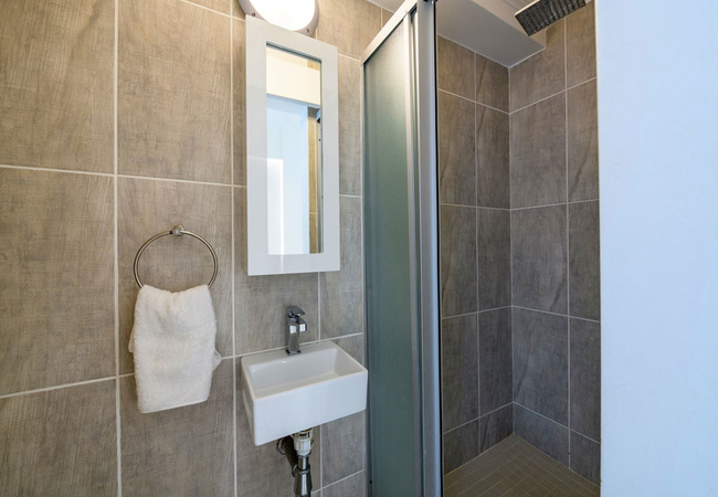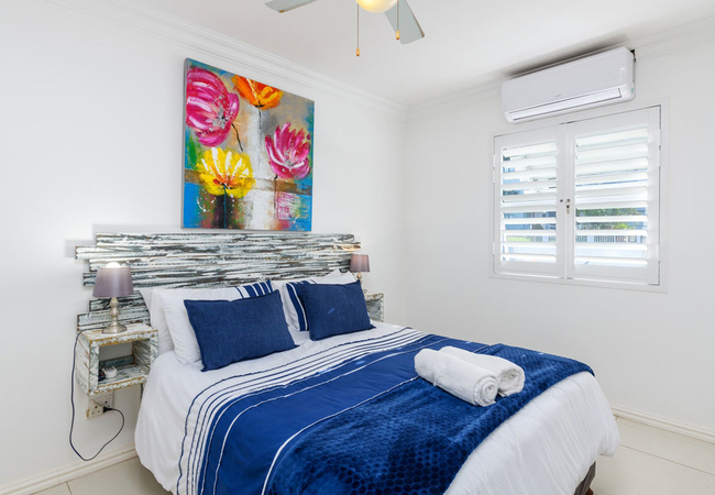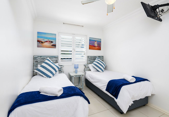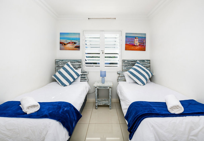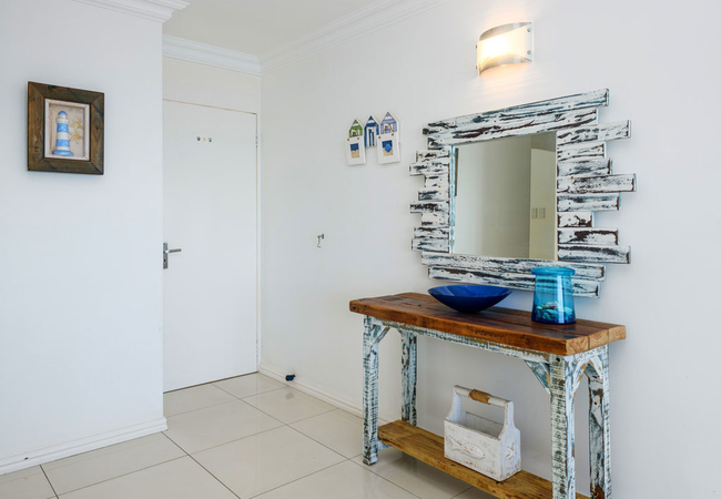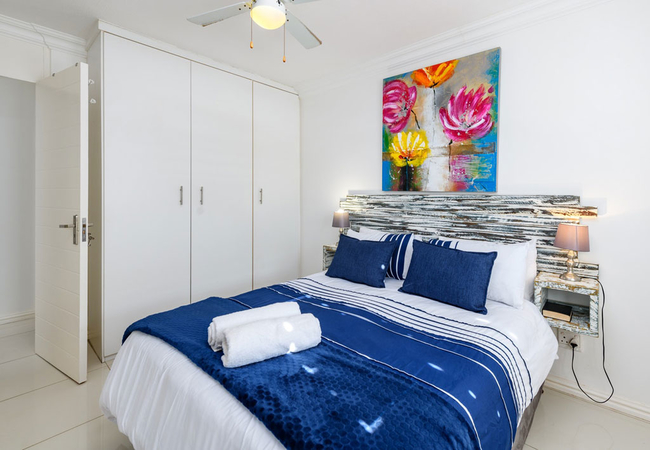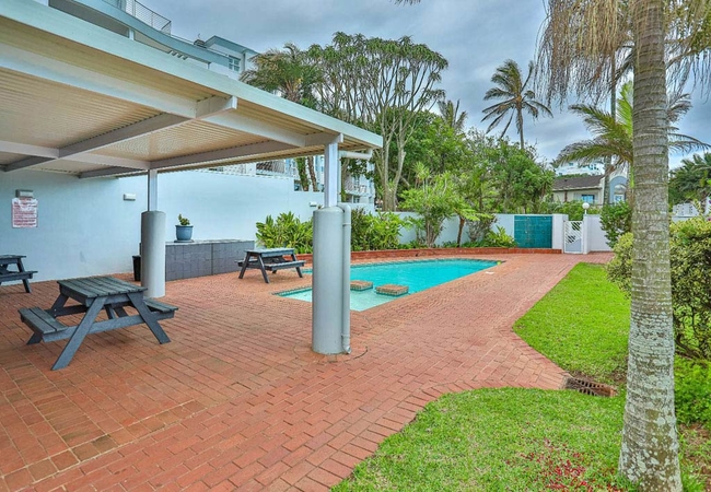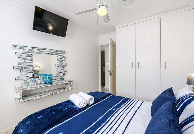 Chakas Cove 54 is a self catering holiday apartment in Shakas Rock sleeping five guests. The main bedroom is furnished with a Queen-size bed, a ceiling fan and has lovely views of the Indian Ocean. The second bedroom is furnished with two single beds and has a ceiling fan. Another child can be accommodated in the lounge. One of the bathrooms is fitted with a shower, toilet and basin, and the other has a bath, shower, toilet and basin.