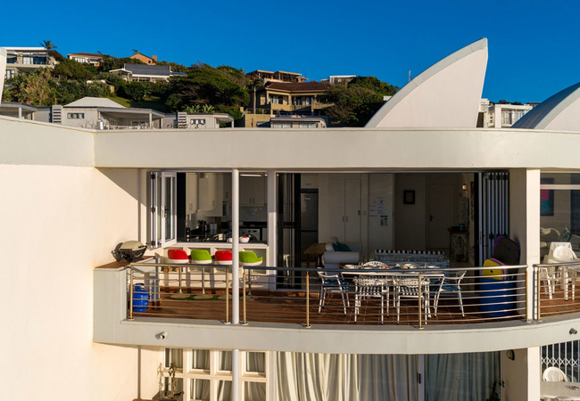 Chakas Cove 54 is a self catering holiday apartment sleeping five guests. The main bedroom is furnished with a Queen-size bed, a ceiling fan and has lovely views of the Indian Ocean. The second bedroom is furnished with two single beds and has a ceiling fan. Another child can be accommodated in the lounge. One of the bathrooms is fitted with a shower, toilet and basin, and the other has a bath, shower, toilet and basin. The stylish open plan living area has comfy seating and a TV with Netflix and free Wi-Fi. The kitchen is fully equipped for your self catering requirements and boasts a washing machine, tumble dryer and dishwasher for convenience. There is a bar counter with stools where you can enjoy your meals and stacking doors that open out onto the balcony for an indoor, outdoor feel. Outside on the balcony there is dining table a gas braai and sensational views. The complex has a swimming pool, communal braai areas and undercover parking.