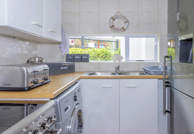 The kitchen is fully equipped for self catering and includes a washing machine. The living area is comfortably furnished and has a dining table, comfortable furniture, TV with satellite channels and a door leading onto the balcony.