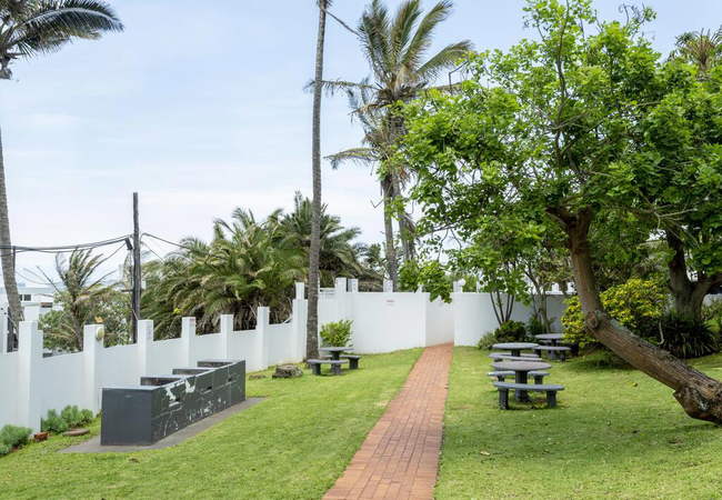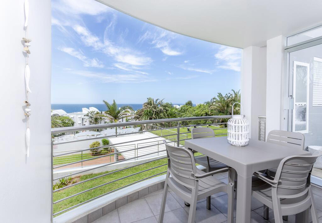 The balcony has outdoor furniture and overlooks the ocean and garden. Braai facilities are available.