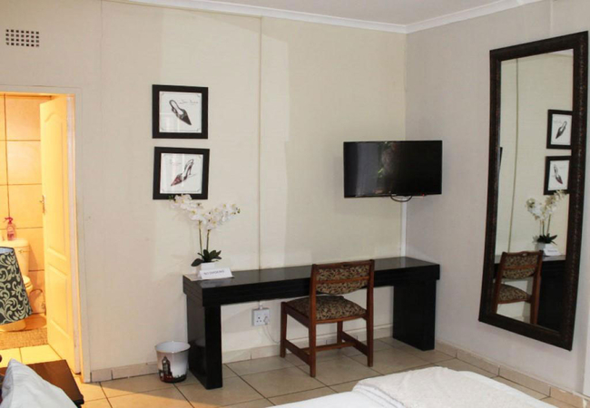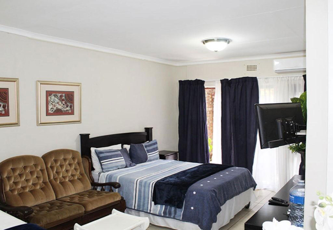 This modern room is furnished with a double bed and would suit a couple or businessman. The pristine en-suite bathroom is fitted with a shower, toilet and basin. This room is thoughtfully equipped with all amenities needed, like air-conditioning, tea and coffee making facilities, DStv and laundry service is included.