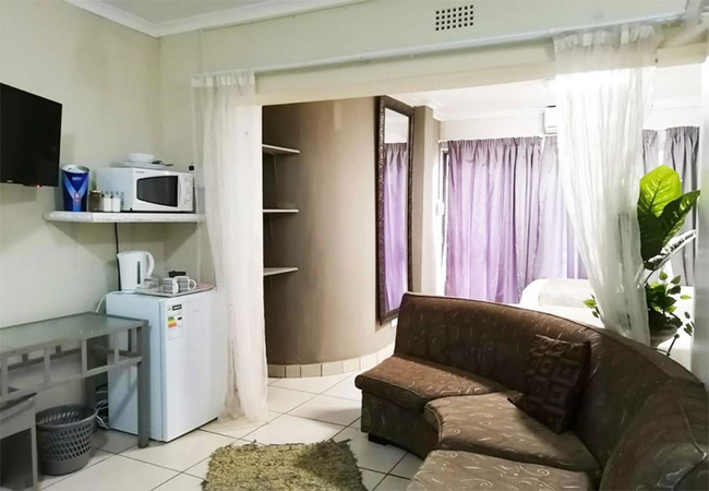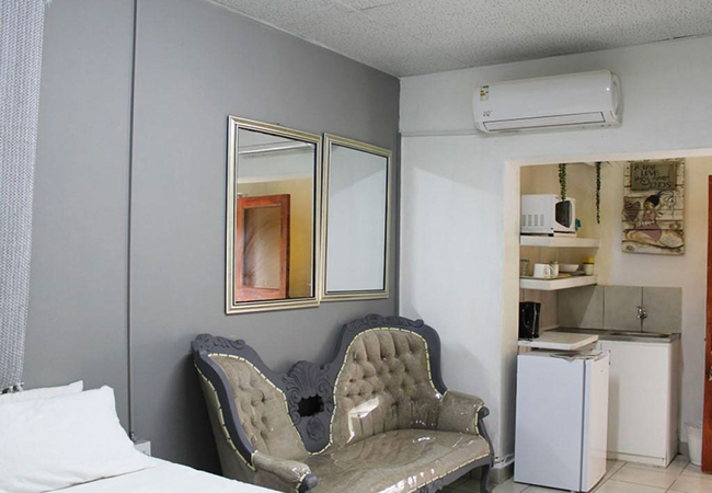 This is a great room for a business trip and is furnished with two single beds. The en-suite bathroom is fitted with a shower, toilet and basin. It has a comfortable seating area and a desk. The kitchenette is an added benefit. Amenities include air- conditioning, DStv, and laundry service.