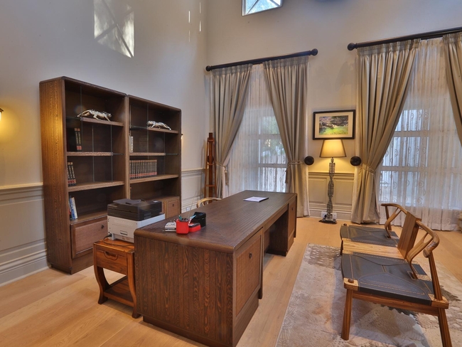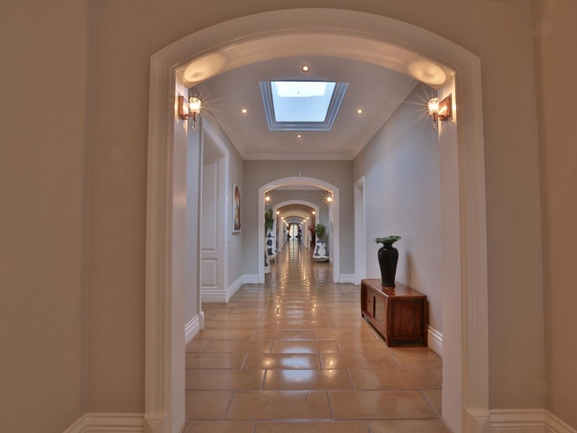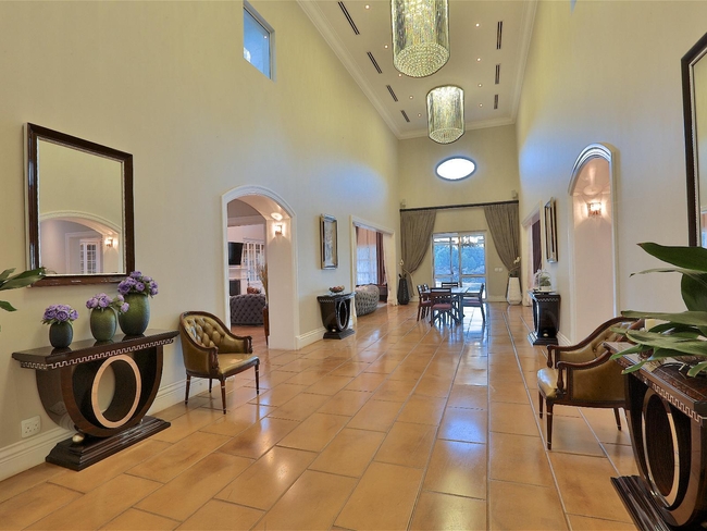 The home's impressive design includes a 90-metre hallway that leads to an expansive dining and living area, beautifully illuminated by exquisite crystal chandeliers. The spacious gourmet kitchen is fully equipped to meet all culinary desires, and a dedicated study area with high-speed WiFi is perfect for those needing to work remotely.