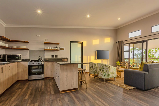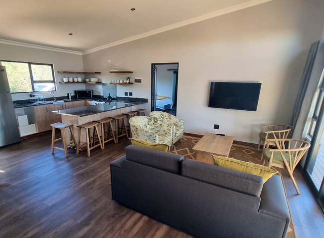 The kitchen is fully equipped for self catering. The living area has a fireplace and a TV with Netflix. Uncapped Wi-Fi is also provided.