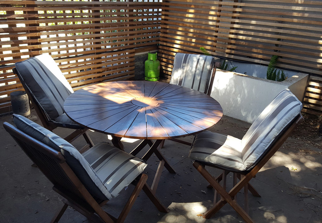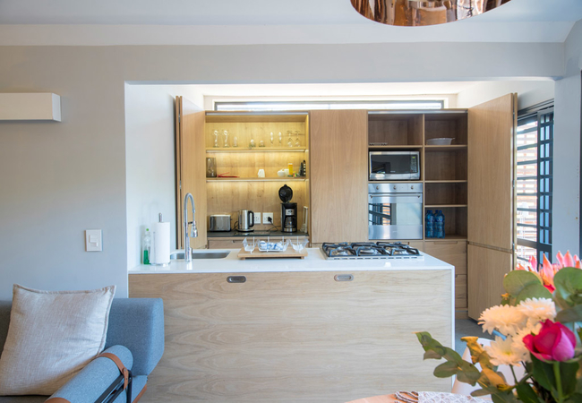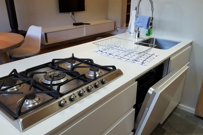 There is a three seater table where guests are able to either work or enjoy their meals. The fully equipped kitchen contains a stove, oven, toaster, tea / coffee making facilities, microwave and a dishwasher.