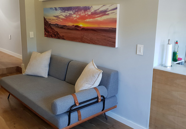 The living area is furnished with a comfortable couch, for an additional guest to sleep on, as well as a wall-mounted, flat-screen Smart TV with DStv.