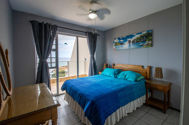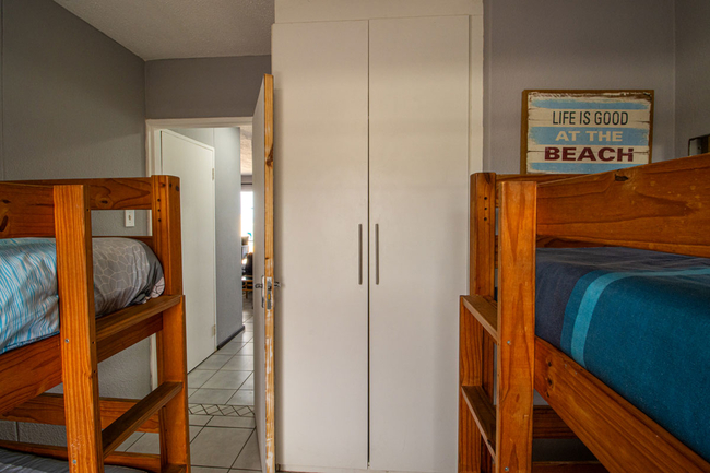 Positioned on the second floor, this apartment comfortably accommodates 2 adults and 4 children, featuring 2 bedrooms and 2 bathrooms. The main bedroom is fitted with a double bed, while the second bedroom is designed for younger guests with two child-only bunk beds. One bathroom is equipped with a shower, while the other has a shower-over-bath combination. Quality linen is supplied, but guests are kindly requested to bring their own towels. The open-plan kitchen is well-appointed with essential appliances, including a stove, oven, microwave, kettle, toaster, and fridge-freezer. The adjoining lounge and dining space offer a welcoming area to relax and enjoy meals together. For entertainment, a flat-screen TV with an OpenView decoder is provided. Glass sliding doors lead out to a balcony where guests can take in breathtaking sea views. The complex offers a range of amenities, including a communal swimming pool, a children’s jungle gym, a tennis court, and dedicated braai facilities. Secure on-site parking is also available for guests' convenience.