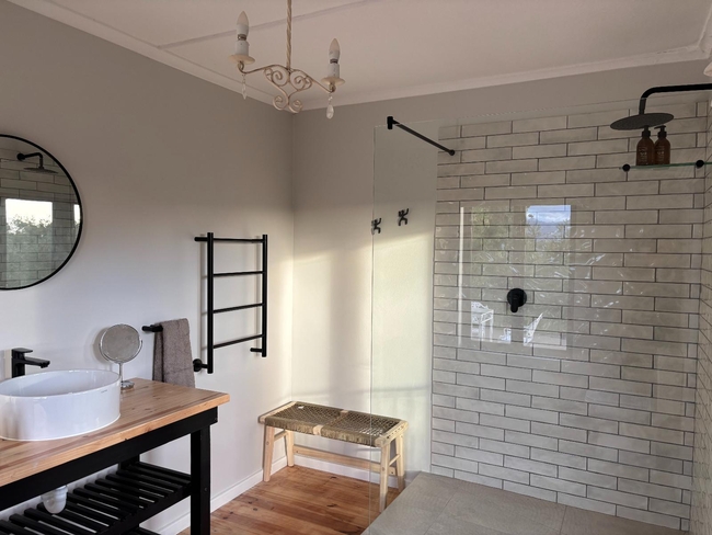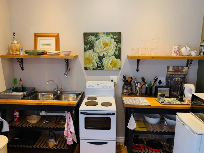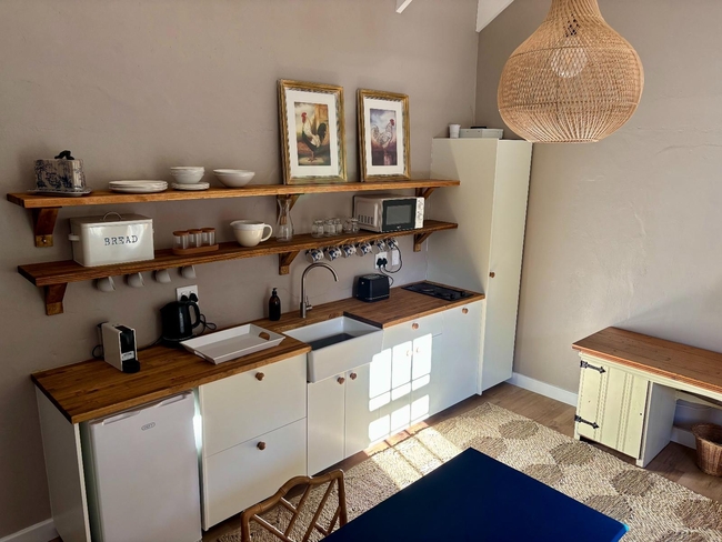 This cosy open-plan cottage offers a welcoming blend of comfort and practicality, with a layout that connects the bedroom and living area for a relaxed, homely feel. The queen-size bed is dressed in crisp 400-thread-count linen, with an electric blanket provided during the colder months for extra warmth. The kitchen is fully equipped for self-catering, featuring a stove, oven, microwave, refrigerator, and both coffee and tea-making facilities, including freshly ground coffee and a plunger for a satisfying morning brew. The bathroom includes a shower, separate bathtub, basin, and toilet, along with quality amenities and a hairdryer. Guests can unwind in the comfortable sitting area by the fireplace, or enjoy the fresh country air on the private terrace. The cottage also includes Wi-Fi, is strictly non-smoking, and comes with an iron and ironing board for added convenience.