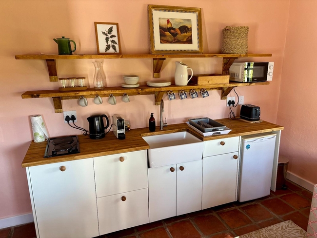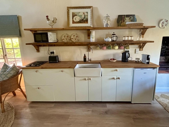 This cosy and classic farm cottage offers a charming escape, complete with one well-appointed queen bedroom and an en-suite bathroom. A separate living area provides space to relax and unwind, while thoughtful details add both comfort and practicality. The kitchenette is equipped with essential appliances, including a refrigerator, microwave, toaster, 2-plate stove, and coffee and tea-making facilities, perfect for light self-catering. A dining table offers a welcoming spot for indoor meals, while the private patio and outdoor dining area invite you to savour the garden views in the fresh country air. Braai/barbeque facilities and outdoor furniture complete the alfresco experience. Inside, guests can enjoy a cosy sitting area with a fireplace, as well as added comforts such as a heater, fan, electric blanket for winter stays, and convenient amenities including an iron, ironing board, and hairdryer. The cottage is non-smoking and offers free Wi-Fi for your convenience.