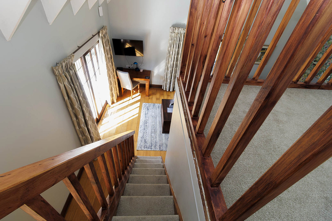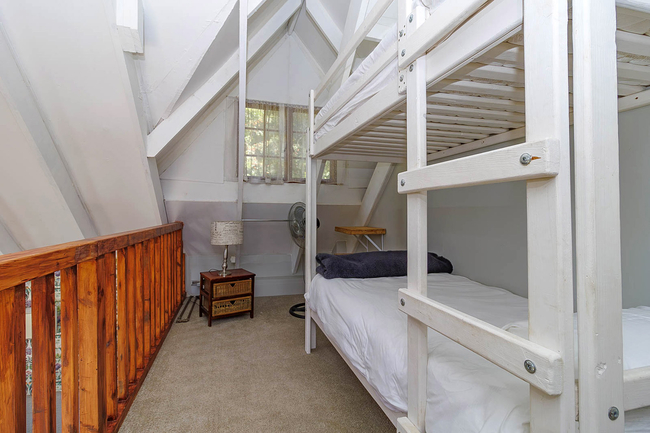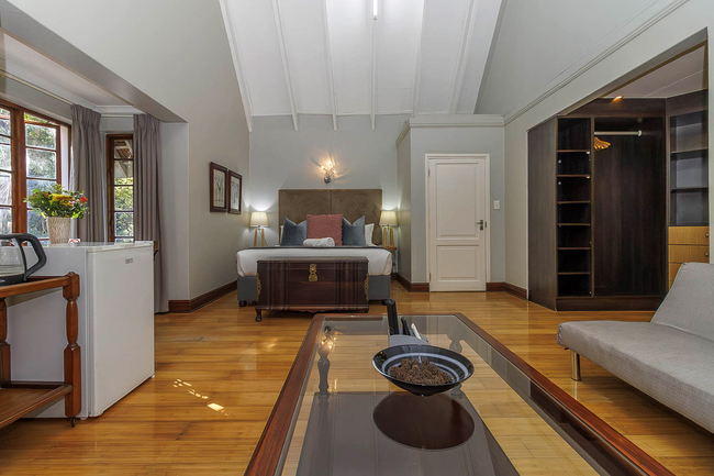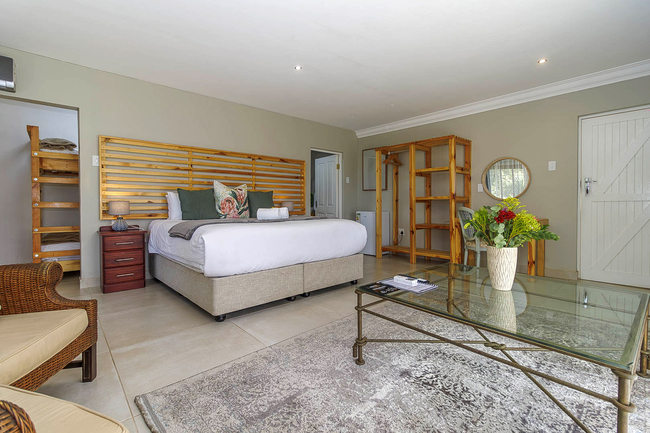Winston Suite is a spacious, double room with direct access to an outdoor veranda. Leads directly to a veranda with outdoor seating. Located on the first floor. The bed is a super- king (extra length and depth) sprung 5 star mattress. On request, it may be split into two single extra length beds. There is a mezzanine level above the bathroom accessible by a flight of stairs, the area has a double bunk, dorma window and bedside table. The bunk has full size sprung mattresses. There is a hairdryer, mini-safe, and tea/coffee making facilities. This suite has a flat-screen TV with a full DSTV PREMIUM package.