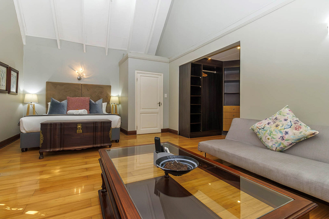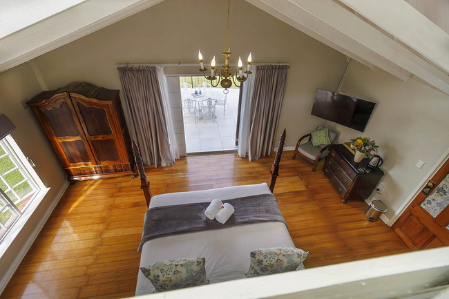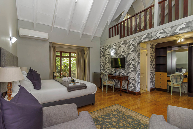 This suite is double volume, fully air-conditioned with an en-suite bathroom and dressing room. Located on the first floor. The bed is a super- king (extra length and depth) sprung 5 star mattress. On request, it may be split into two single extra length beds. There is a mezzanine level above the bathroom accessible by a flight of stairs, the area has a two single beds a dorma window and bedside table. There is a hairdryer and tea/coffee making facilities, a seating area and desk, ideal for catching up on admin. This suite has a large flat-screen TV with a full DSTV PREMIUM package. Stepping out of the room, and across a passage, there is access to the wrap around veranda with outdoor seating.