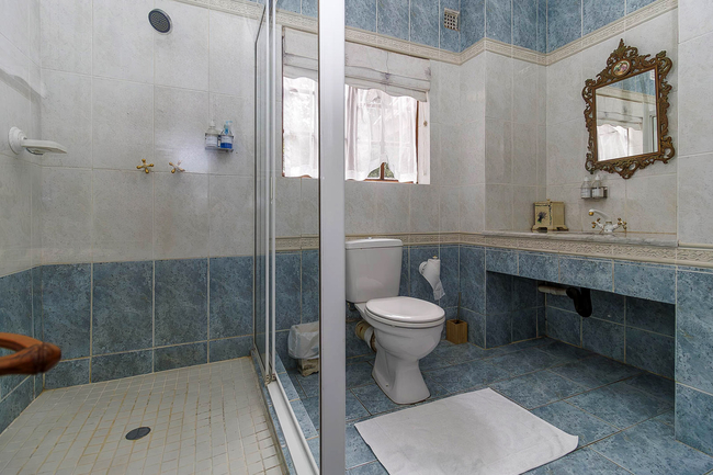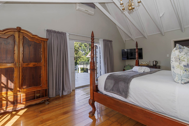 This room has direct access to the balcony. Located on the first floor. It is fully air-conditioned with a flat screen TV and the BASIC DSTV PACKAGE. Randolph has a double bed, ideal for a single person or a couple. There is a step across the passage to the private bathroom with a beautiful ball and claw antique bath, glass ceiling and full size shower, bidet and hand-basin.
