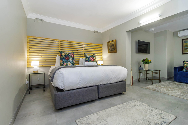 This suite is double volume, fully air-conditioned with an en-suite bathroom and dressing room. Located on the first floor. The bed is a super- king (extra length and depth) sprung 5 star mattress. There is a hairdryer and tea/coffee making facilities, a seating area and desk, ideal for catching up on admin. The seating area is a “couch sleeper” which can be setup for a child. This suite has a large flat-screen TV with a full DSTV PREMIUM package. A few steps down the passage, there is access to the wrap around veranda with outdoor seating.