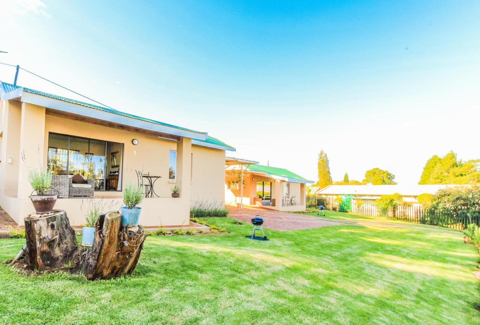 Two self catering cottages. Each is furnished with a Queen-size bed and has an an en-suite bathroom fitted with a shower, basin and a toilet. Bed linen and bathroom towels are provided. There is an open plan kitchenette that consists of a microwave, bar fridge and tea / coffee making facilities. There is a comfy living area and Wi-Fi available. There is a patio with outdoor furniture and braai facilities where guests are able to relax and look upon the garden views.