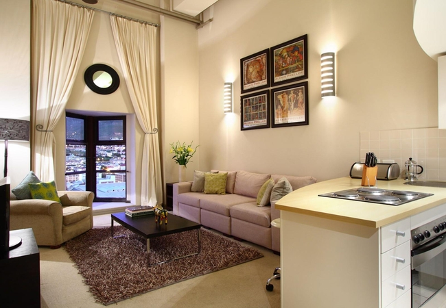 This lovely one bedroom Exclusive Use Holiday Apartment sleeps two guests in a queen sized bed found on a spacious mezzanine level overlooking the living area. The room has built in cupboards and a dressing table. The bathroom is located on the same floor as the living area and has a bath only. The lounge is warm and welcoming with soft, cosy furniture, a coffee table and a TV with selected DStv and a DVD player. The kitchen has a breakfast bar with bar stools and is well equipped for your self catering needs. There is a fridge with a freezer, oven, hob, kettle, toaster, microwave, crockery, cutlery, glassware and cookware. The windows are a feature and offer magnificent city views and a view of the town hall.