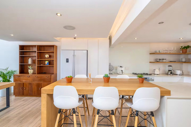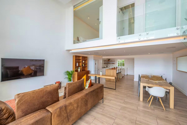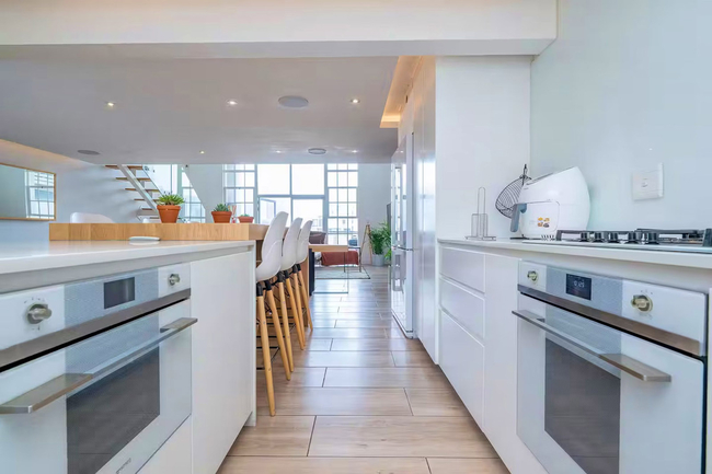 This stylish apartment is spread across two floors and can comfortably accommodate up to four guests. It comprises two well-sized en-suite bedrooms, making it an excellent choice for couples travelling together or small families. The main bedroom boasts a luxurious king-size bed, while the second bedroom is furnished with a comfortable queen-size bed. Both en-suite bathrooms are fitted with a shower, basin, and toilet. Quality linen and bath towels are provided for guests’ use, although beach towels should be brought along if you're planning seaside outings. The open-plan living area has been designed with relaxed city living in mind. The kitchen is fully equipped to meet all self-catering needs and features a gas hob, electric oven, air fryer, microwave, and fridge-freezer, along with cutlery, crockery, and glassware. A central island with stools provides a convenient space for casual dining or a morning coffee. Just beyond, a formal dining table invites guests to gather for shared meals or leisurely conversations over a bottle of wine. The lounge is comfortably furnished, offering a TV and plush seating for quiet evenings indoors. Complimentary Wi-Fi is also included to keep guests connected throughout their stay. Glass doors open onto a generous patio, complete with a private lounging area and built-in braai facilities—perfect for laid-back afternoons or enjoying sundowners as the city transitions into evening. This outdoor space brings a breath of fresh air to city living, offering a tranquil escape after a busy day exploring.