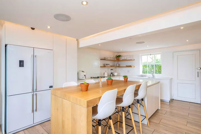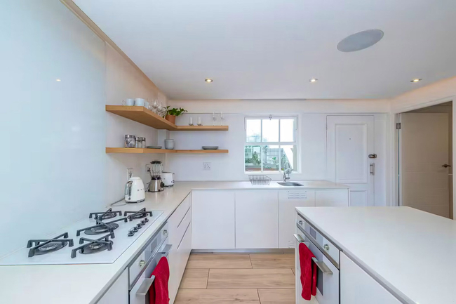 The open-plan living area has been designed with relaxed city living in mind. The kitchen is fully equipped to meet all self-catering needs and features a gas hob, electric oven, air fryer, microwave, and fridge-freezer, along with cutlery, crockery, and glassware. A central island with stools provides a convenient space for casual dining or a morning coffee.