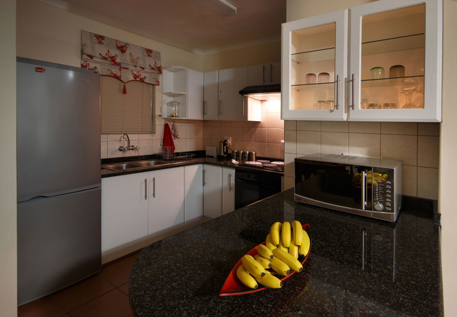 The living area is cosy and has a flat screen TV with DStv and comfy furniture. There is a small dining area and a modern kitchen equipped with everything you will require during your self catering stay.