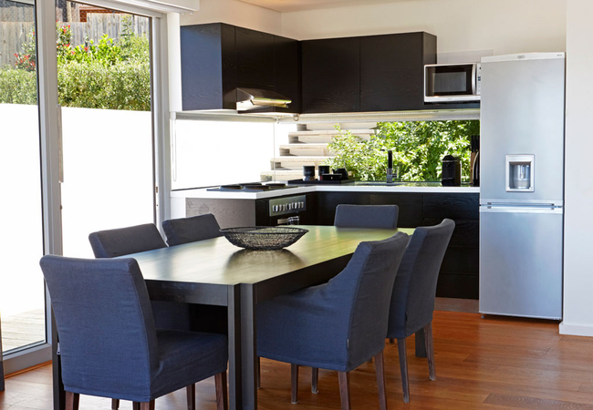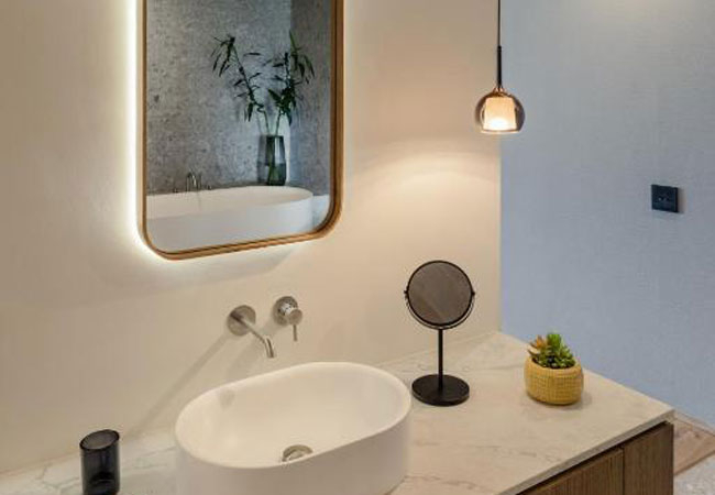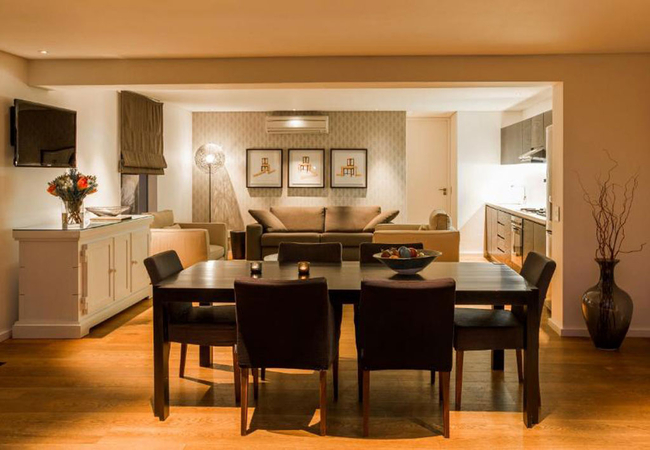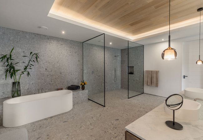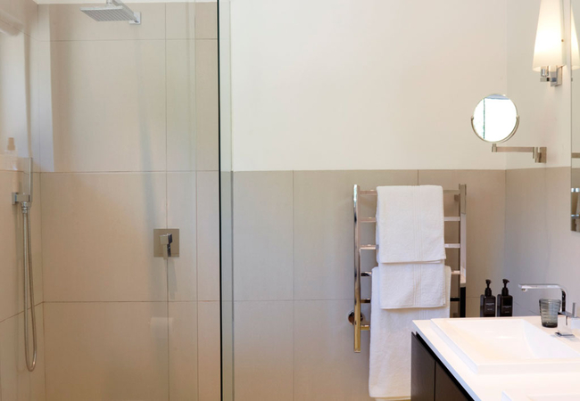 The Vineyard Suites have one bedroom furnished with a King-size bed. The en-suite bathroom is fitted with a shower, toilet and basin. Some rooms also have a bath. Two children over the age of 12 can be accommodated in the lounge on a double sleeper couch. There is a fully equipped kitchen. Amenities include a Nespresso machine, Smart TV with satellite channels and a range of streaming services. The bathrooms offer MOOOI and Charlotte Rhys toiletries, a high-quality hairdryer, flip-flops and heated towel rails. The terrace at the front of the villa offers a perfect setting for an al-fresco lunch or dinner. When relaxing indoors, air conditioning all around and underfloor heating in the bathroom makes for perfect temperatures during all