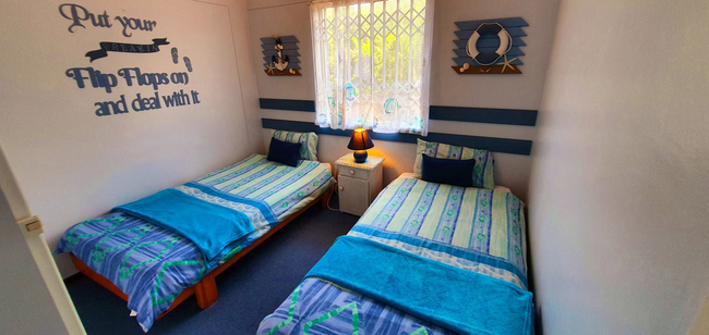 Club Cabana 13 is a self-catering holiday apartment in Ramsgate South. It offers a charming balcony that overlooks the complex swimming pool and a well-kept lawn, creating a pleasant outdoor setting. The apartment provides three bedrooms, two bathrooms, and an open-plan living space that combines the kitchen, dining, and lounge areas. The main bedroom is furnished with a queen-size bed and has an en-suite bathroom with a shower, toilet, and basin. The second bedroom contains a double bed, while the third bedroom is fitted with two single beds. The second bathroom includes both a bath and a shower, along with a toilet and basin. The kitchen is fully equipped for self-catering, complete with a stove, oven, fridge-freezer, microwave, and all necessary cutlery and crockery. A breakfast bar with stools adds to the convenience. The dining area seats six people comfortably, while the lounge features a welcoming suite and a flat-screen TV. From the living area, sliding doors lead out to a private patio furnished with outdoor seating and braai facilities, perfect for alfresco dining. Guests also have access to the complex swimming pool and a games room, and the unit includes a designated carport for secure parking.