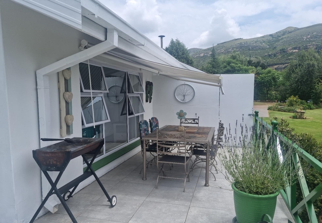 A stylish, sunny, secure, and cosy two bedroom, two bathroom cottage. One bedroom has a Queen-size bed, another has a King-size (or twin beds). There is an open-plan lounge with full DStv, a fully equipped kitchen and enclosed patio dining area boasting serene spectacular Clarens.