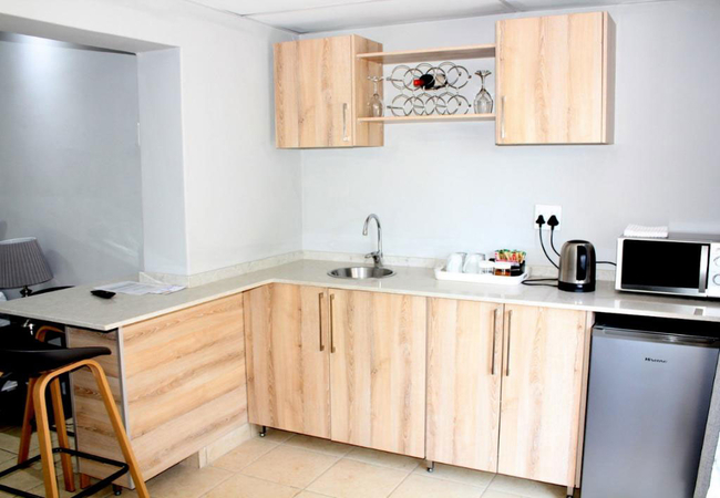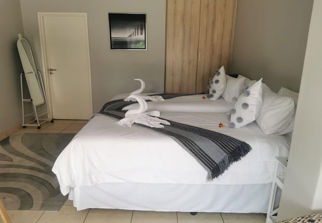 The Self Catering Room is furnished with a Queen-size bed and three single beds. The en-suite bathroom is fitted with a shower, toilet and basin. Each room has Wi-Fi, TV with DStv, a desk, safe, ceiling fan, hairdryer, tea / coffee facilities and a patio. This room also has a kitchenette with a hob, fridge and microwave.