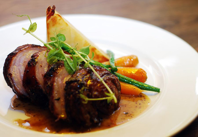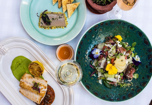 Helena's Restaurant is located in two adjoining dining areas within Coopmanhuijs. The first area, beneath an antique yellow-wood ceiling, is appointed with richly embossed French wallpaper. Lighted trees intricately made of wire adorn an entire wall. In the second dining area, hand-hewn poplar dining chairs are set beneath the glass roof of a charming conservatoire, which opens onto the enclosed courtyard and swimming pool.