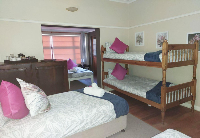 The Floral Family Room is furnished with a King-size bed that can be converted to twin beds on request, a bunk bed and two single beds in the alcove. The bathroom is fitted with a shower, bath, toilet and basin. Amenities such as a TV with YouTube and Netflix apps, free Wi-Fi access, a bar fridge, a hairdryer, tea- and coffee-making facilities, hot water bottles for winter nights, and other amenities for convenience.