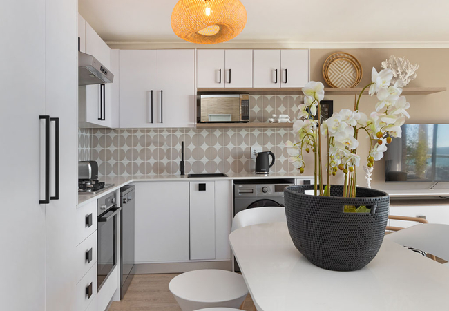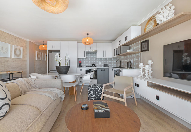 Coral Island 204 has two bedrooms. The main bedroom offers a Queen-sized bed with majestic ocean views and an en-suite bathroom including a shower, toilet and basin atop a vanity. The second bedroom offers two single beds that can be placed together on request for a luxurious King-size feel - and makes use of a shared bathroom, also including the same features as the en-suite bathroom. All linen and towels are provided for your stay. The open-plan design of the living space allows a peaceful and intimate flow from one area to the other, and for those who enjoy culinary pursuits, the fully equipped kitchen is a standout feature. High-end appliances such as dishwasher and washer/dryer combo, ample counter space, and sleek design make it a pleasure to prepare meals with a view of the ocean as a backdrop. The dining table seats six comfortably with more than enough space to enjoy delicious meals with friends or family, and the cozy lounge area with a fitted flat-screen TV provides the perfect spot for some downtime. A stroll out onto a gorgeous undercover balcony, with outdoor furniture, boasting the most spectacular ocean and mountain views serving as a serene escape to soak in the sea breeze and the captivating views.