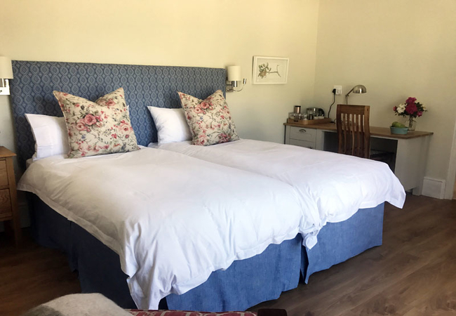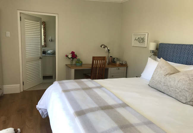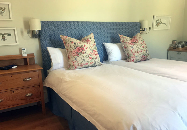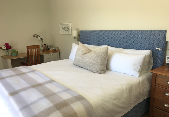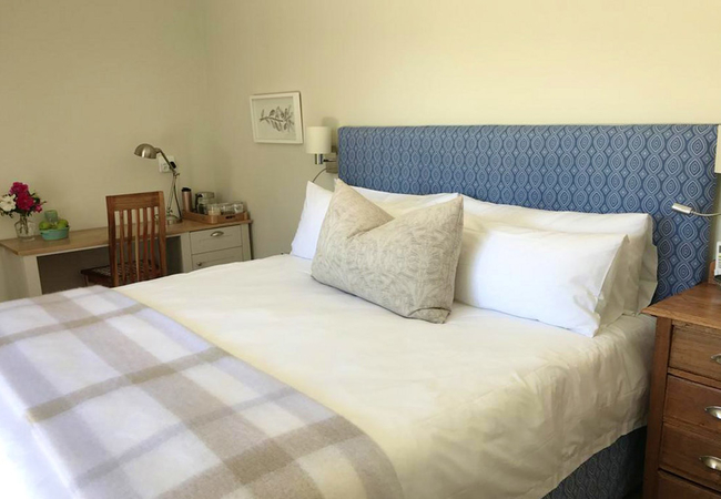 Luxurious room with two single beds or one king size bed. Cotton percale linen bedding. En-suite bathroom has a walk-in shower. Room has air-conditioning, DSTV, flat screen TV and view over the rose gardens and St Aidans. Complimentary Toiletries. Free Wi-Fi.