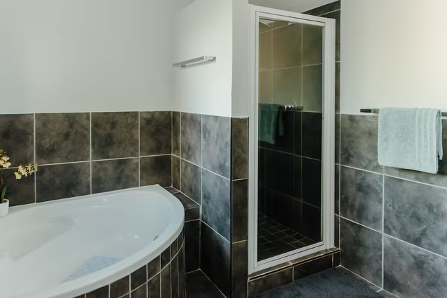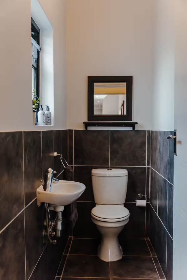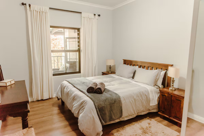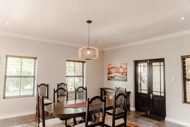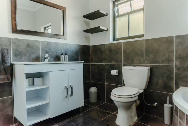 Cosy Cape Dutch near the sea offers a spacious deluxe 3-bedroom villa, each bedroom featuring a queen-size bed and ceiling fan. The villa includes two bathrooms, both with separate bath and shower, plus an additional guest toilet, ideal for families or groups.