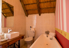 This private en suite bedroom is linked to the main house and features a beautiful thatch roof with a private entrance via a wooden staircase outside the house. It is furnished with a King-size bed (can be made up as 2 singles) and the en-suite bathroom is fitted with a bath, NO SHOWER. The room features a heat and eat facility only (no kitchen/kitchenette), equipped with a bar fridge, kettle, toaster and microwave. It also features a TV with DSTV Premium. Towels are provided with quality linen including a down duvet and an electric blanket. A vanity, wardrobe, heater, fan, and 2 lounge chairs ensure that guests are comfortable while staying at Cottage Pie. Please take note that the Upstairs Under Thatch Unit does not have braai facilities or a private garden. Upstairs Under thatch Room is not pet friendly.