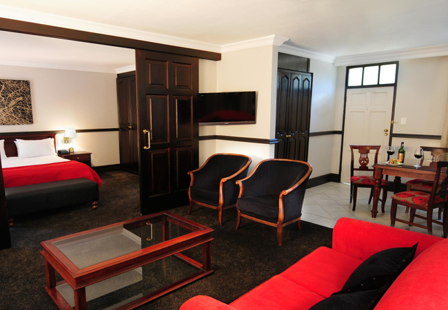 This suite is furnished with a queen-size bed and en-suite bathroom fitted with a bath, shower, toilet and basin. The suite is equipped with air-conditioning, a TV with DStv, safe for valuables, a desk, seating area, and a kitchenette with a small fridge, tea and coffee station and microwave.