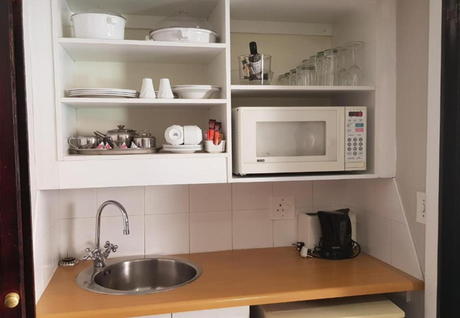 This studio suite is furnished with twin beds and an en-suite bathroom fitted with a bath, shower, toilet and basin. The suite is equipped with air-conditioning, a TV with DStv, a safe for valuables, a desk, and a kitchenette with a small fridge, tea and coffee station and microwave.