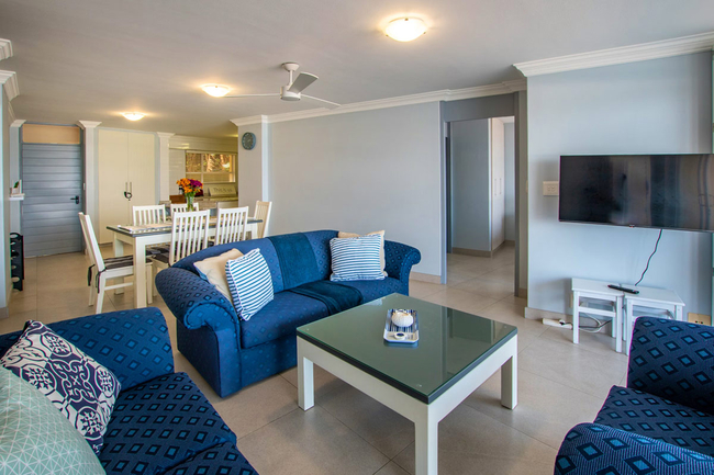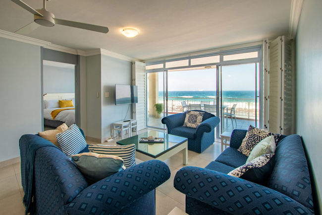The living area includes a comfortable lounge suite, a dining table for six, and a television for entertainment. Guests can enjoy the private balcony, which offers an outdoor dining area and uninterrupted views of the ocean. The apartment also provides complimentary Wi-Fi and secure on-site parking for convenience.