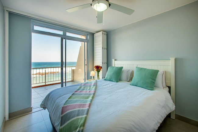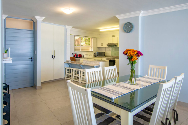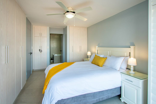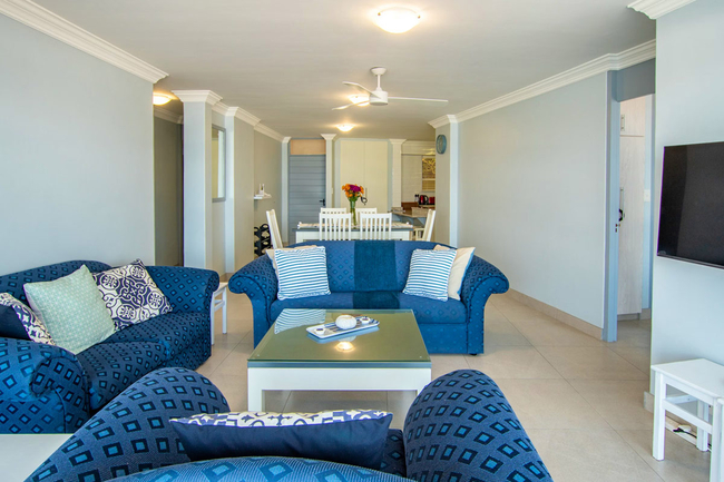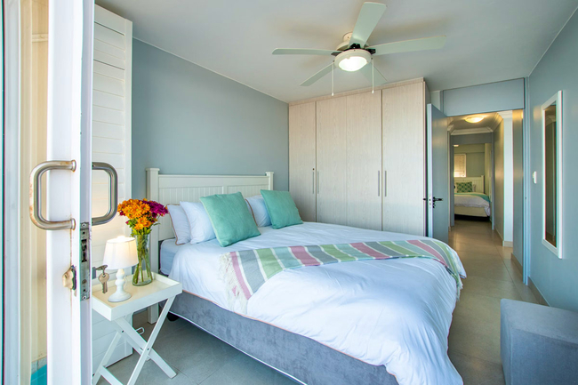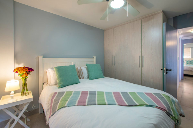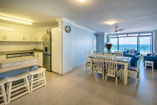 This stylishly appointed apartment comprises three bedrooms and can comfortably accommodate up to six guests. The main bedroom is furnished with a double bed and includes an en-suite bathroom with both a bath and a shower. The second bedroom also features a double bed, while the third bedroom contains two single beds, and these two rooms share a bathroom equipped with a shower. The kitchen is fully fitted with modern appliances, including a fridge-freezer, stove, oven, microwave, washing machine, and tumble dryer, providing everything required for self-catering. The living area includes a comfortable lounge suite, a dining table for six, and a television for entertainment. Guests can enjoy the private balcony, which offers an outdoor dining area and uninterrupted views of the ocean. The apartment also provides complimentary Wi-Fi and secure on-site parking for convenience. The complex offers a communal swimming pool, a braai area, and shared laundry facilities, all available for guest use.