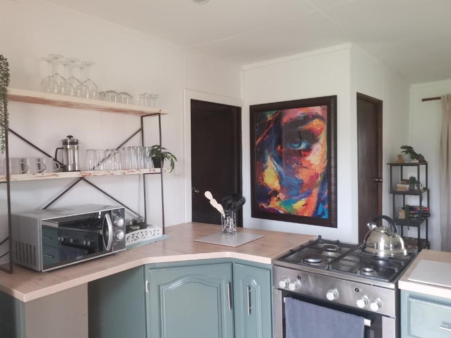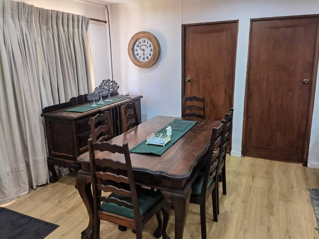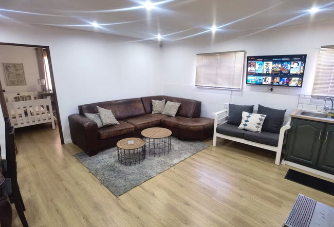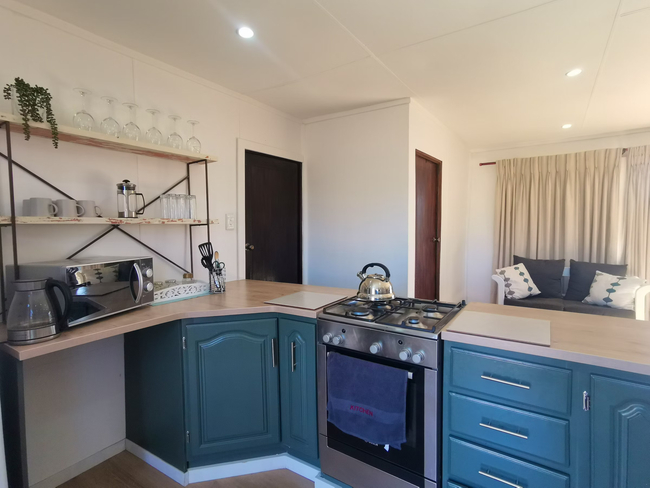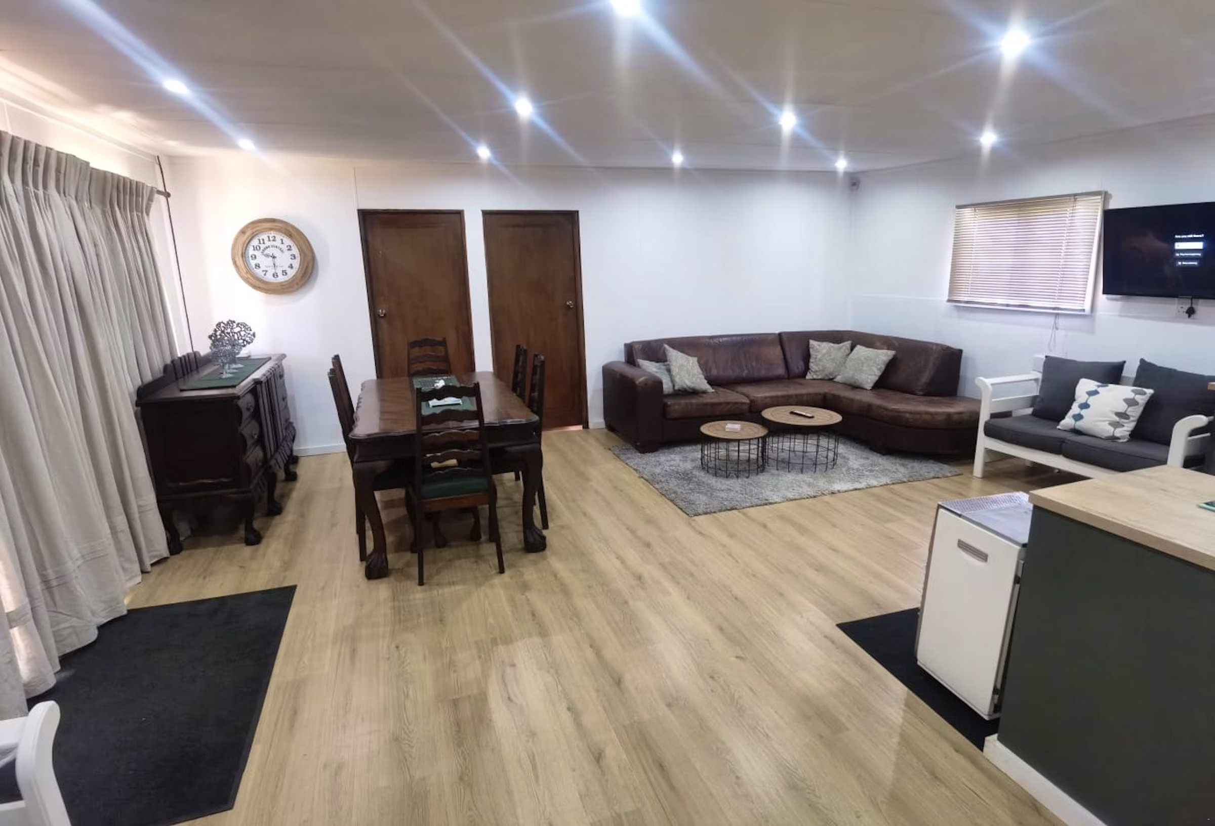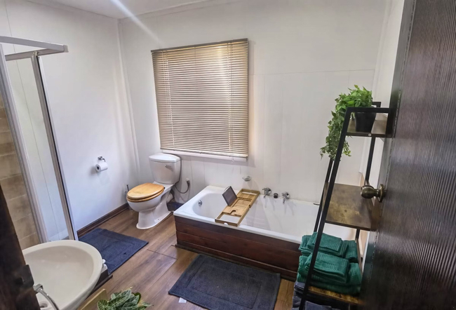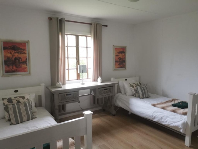 This charming timber home comfortably accommodates up to six guests, offering three welcoming bedrooms. Two of the bedrooms are fitted with luxurious queen-sized beds, while the third features two single beds. A well-equipped bathroom, complete with a bath, shower, and toilet, ensures convenience throughout your stay. To enhance comfort, all linen and bath towels are thoughtfully provided. The open-plan living space includes a fully equipped kitchen, offering everything you need, from a stove and oven to a microwave, fridge, cutlery, and crockery. Tea and coffee making facilities are also at hand. The adjoining dining area, with its six-seater table, provides an inviting space for shared meals. In the lounge, comfortable seating and a wall-mounted TV create the perfect spot to relax after a day of exploration, while free Wi-Fi allows you to stay connected and plan your next outing effortlessly. Outdoors, guests can enjoy the tranquillity of the braai area, which overlooks the expansive grounds—a serene setting for outdoor meals and relaxation. Secure parking is also available for added peace of mind.
