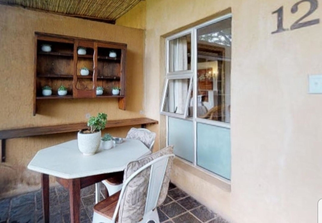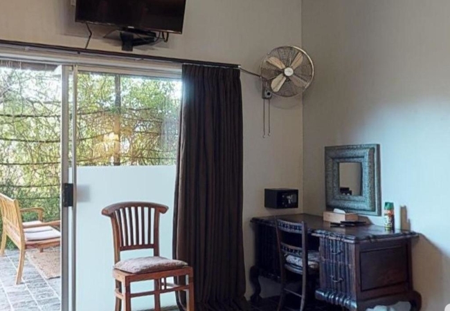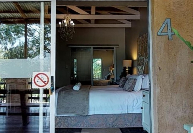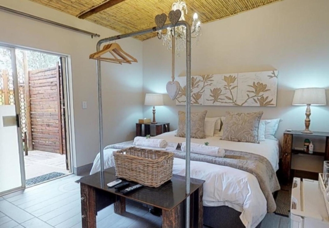 This suite is furnished with a Super King-size extra length bed that can be split into twin beds. The en-suite bathroom is fitted with a shower, toilet and basin. The room is equipped with a 32" LED TV with SABC channels, e-TV and selected DSTV channels, Bar fridge, Air-con, coffee and tea facilities and a patio with a garden view.