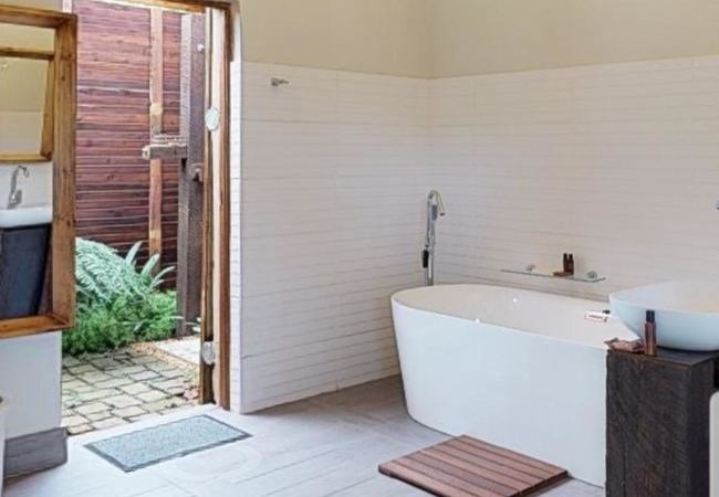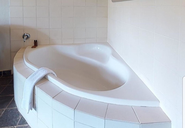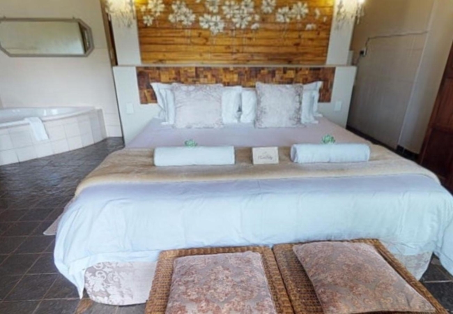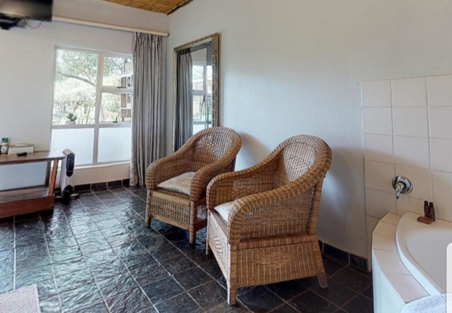 This suite is furnished with a King-size bed. The en-suite bathroom is fitted with a bath, shower, toilet and basin. The room is equipped with a 32" LED TV with SABC channels, e-TV and selected DSTV channels, Bar fridge, Air-con, coffee and tea facilities. The room has a patio and jacuzzi.