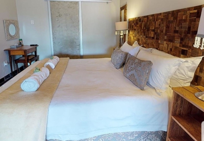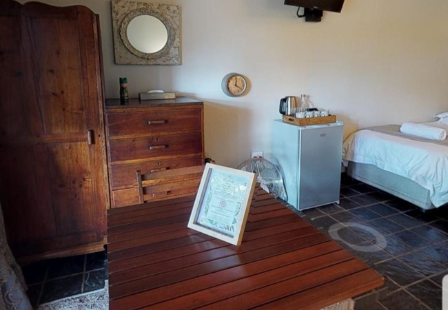 This suite is furnished with a King-size or twin beds. The en-suite bathroom is fitted with a shower, toilet and basin. The room is equipped with a 32" LED TV with SABC channels, e-TV and selected DSTV channels, Bar fridge, Air-con, coffee and tea facilities.