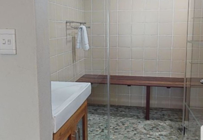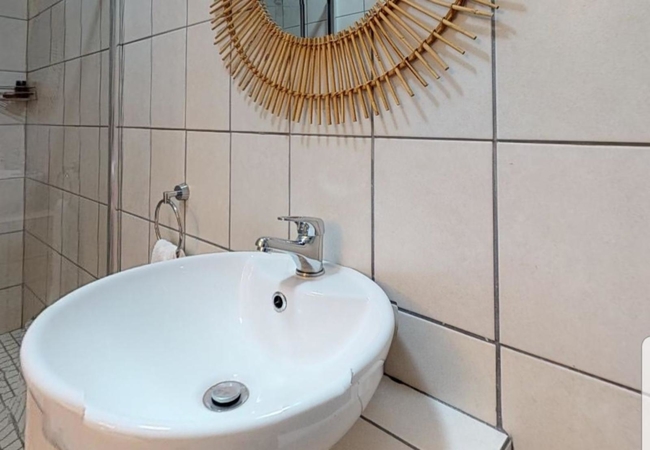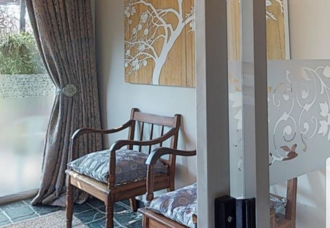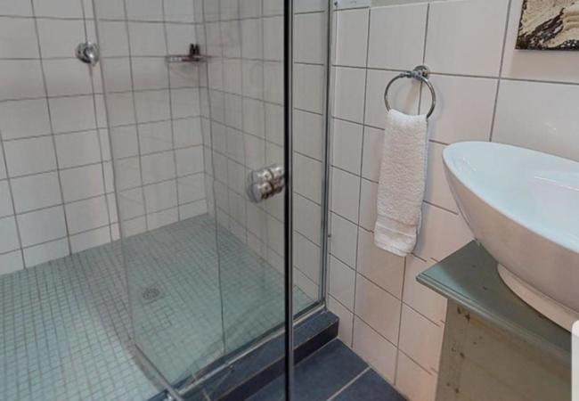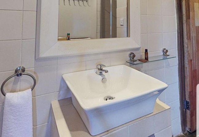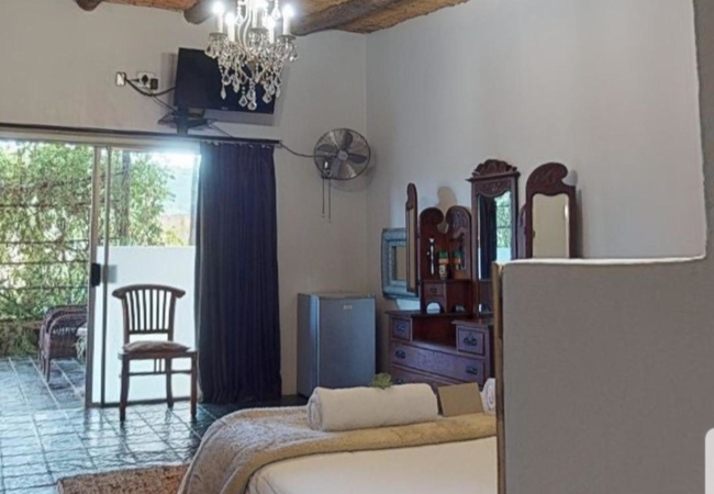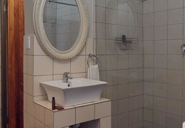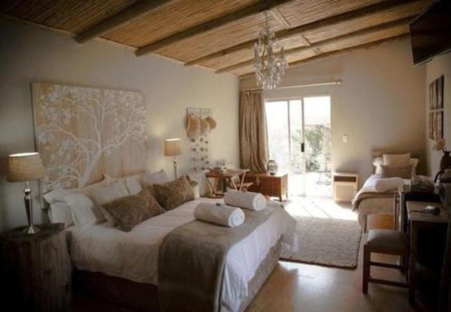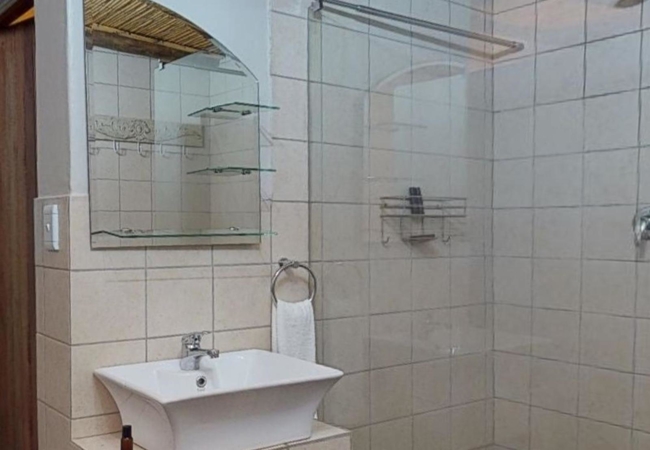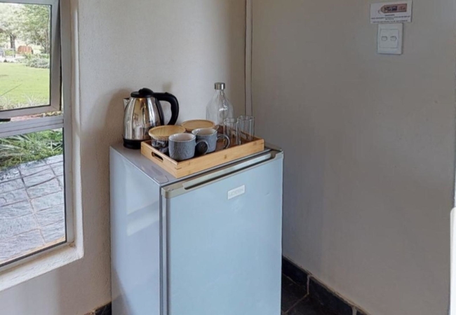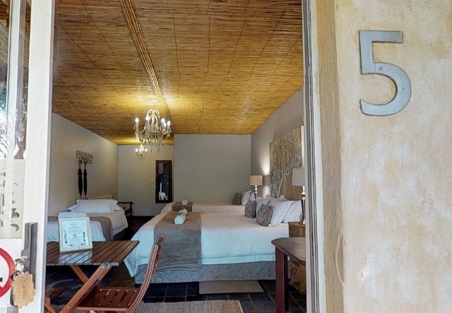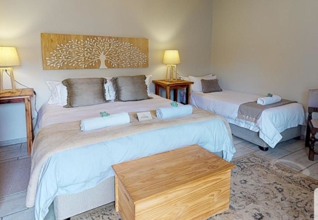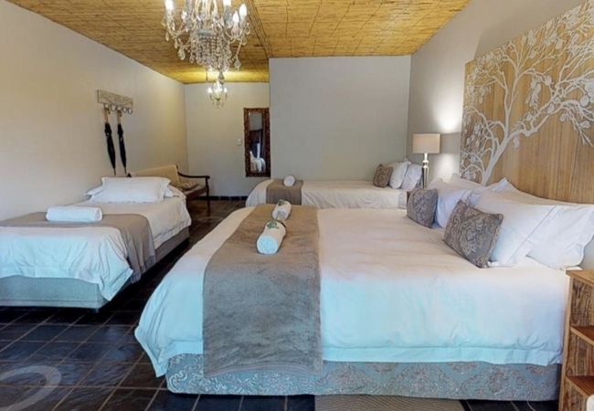 This suite is furnished with a Queen-size and two single beds. The en-suite bathroom is fitted with a shower, toilet and basin. The room is equipped with a 32" LED TV with SABC channels, e-TV and selected DSTV channels, Bar fridge, Air-con, coffee and tea facilities.